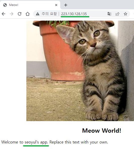 결과로 나타나는 output 내용으로 생성된 server 리소스의 public_ip가 출력된다. 해당 주소로 접속해보면 지난번 콘솔을 통해 진행했던 내용과 같이 고양이 사진과 함께 Meow World 사용자 앱을 볼 수 있다.