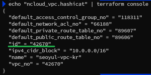 두 결과를 비교해보면 같은 값임을 확인할 수 있다. 특히 중요한 내용으로 네이버 클라우드 플랫폼 프로바이더는 리소스의 ID를 바탕으로 의존관계 등을 파악하고 동작하며 각종 CRUD에 사용된다는 점을 알아둬야 한다.