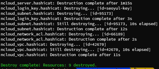 이번에 진행한 워크샵은 적지만 비용이 발생하는 내용이기 때문에 사용이 끝나면 반드시 자원을 정리해줘야 한다. 테라폼을 통해 생성한 자원은 간단한 명령어를 이용해 깨끗하게 제거할 수 있다. 아래 명령어를 사용한다.