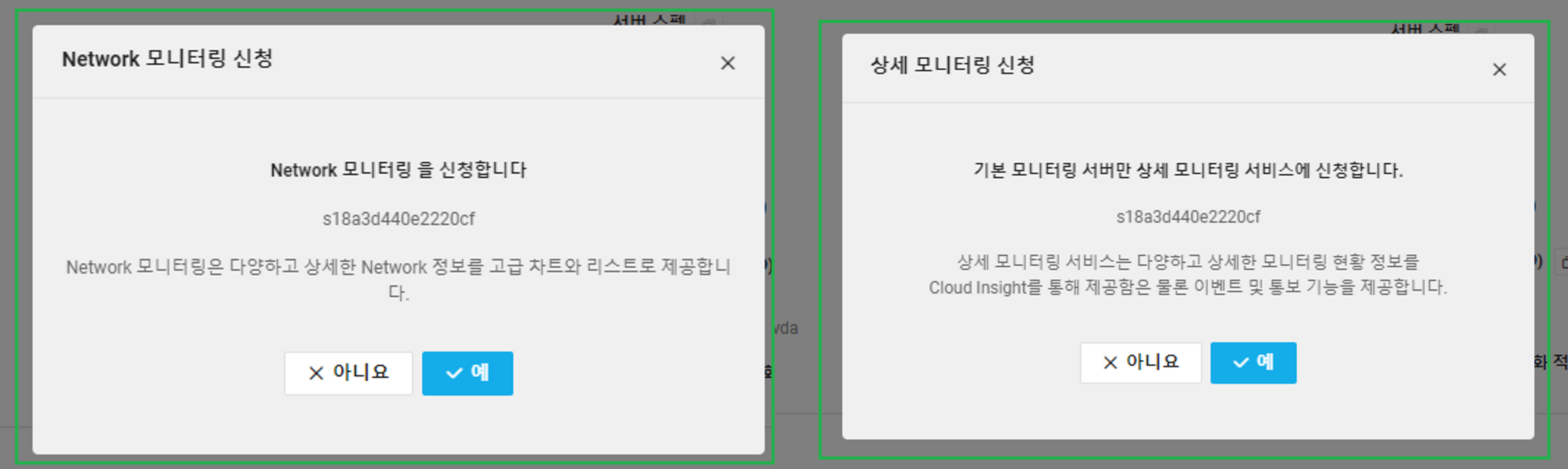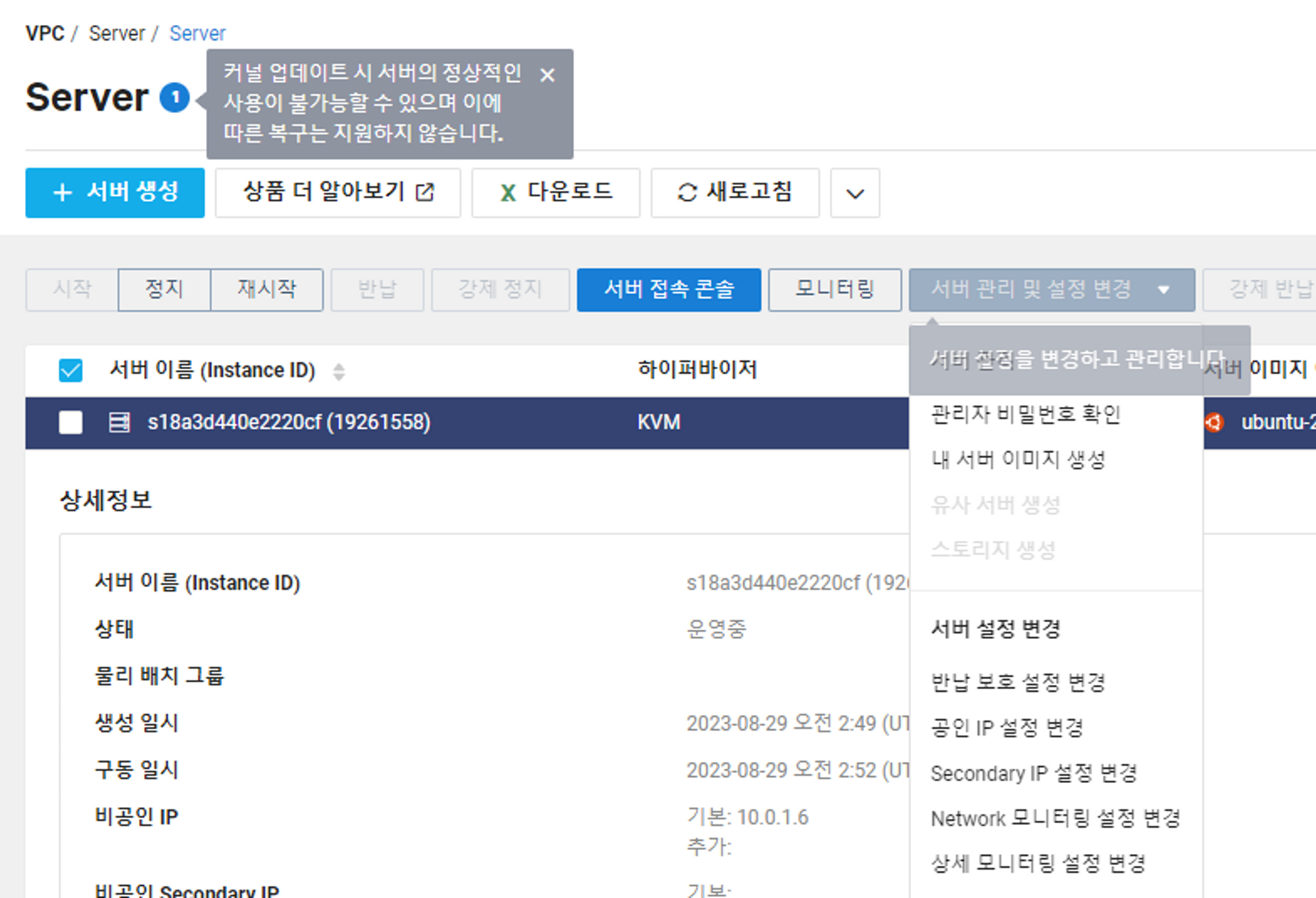 서버 탭에서 서버를 클릭한 후, 상단의 `서버 관리 및 설정 변경` 풀다운 메뉴를 눌러보면 `Network 모니터링 설정 변경` 과 `상세 모니터링 설정 변경`을 확인할 수 있다. 해당 버튼으로 각 확장 기능을 활성화 시킬 수 있다.